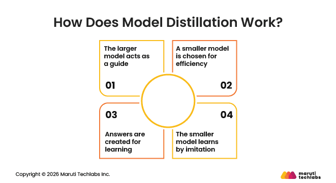 Model distillation works on a simple idea: a smaller model learns by watching a larger one. Instead of learning everything from scratch, it is guided by a model that already performs well.